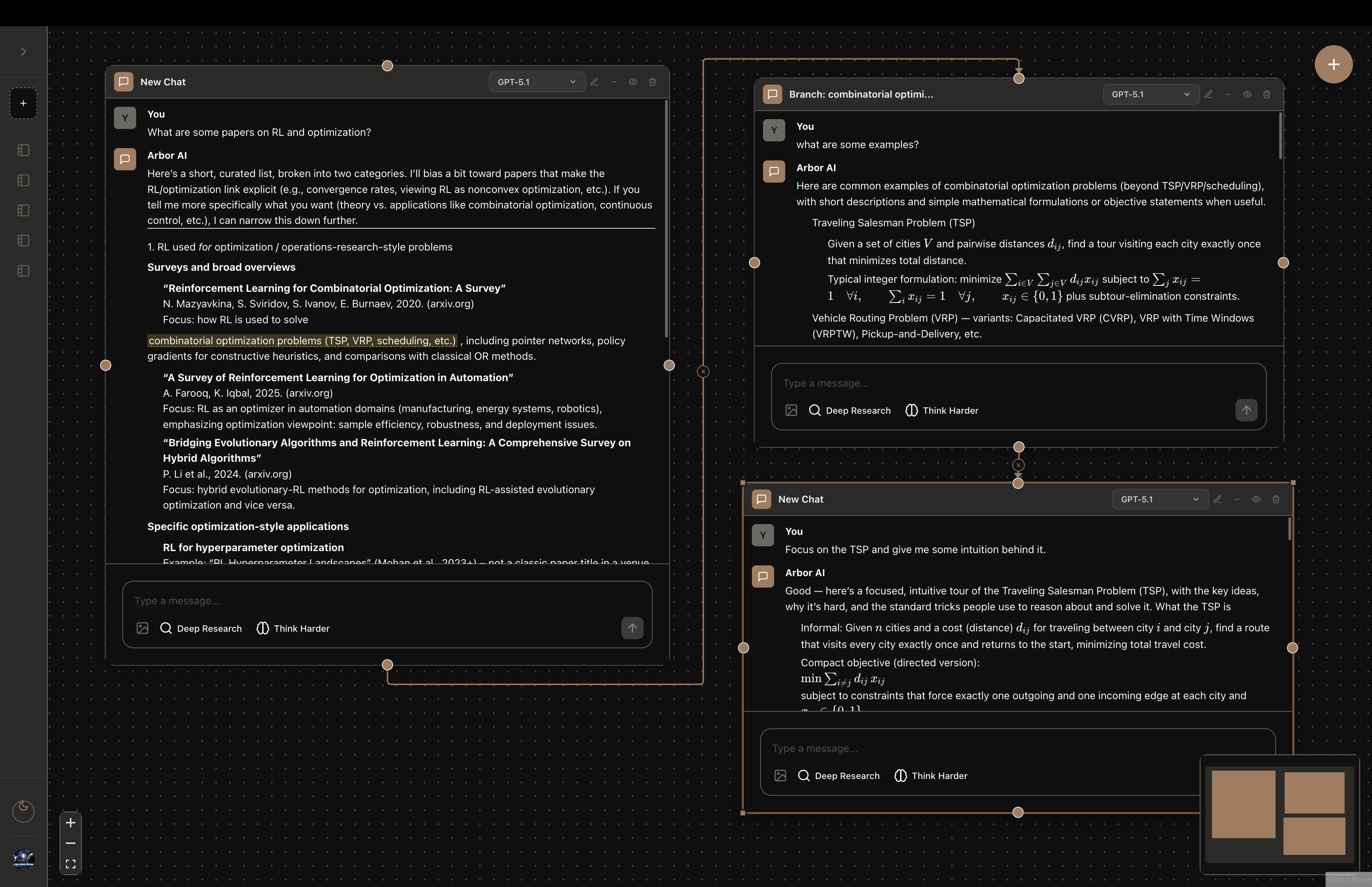 Arbor is a canvas-based application that enables non-linear exploration of ideas through AI-assisted conversations. Unlike traditional chat interfaces, Arbor lets you branch, fork, and visually connect multiple conversation threads.